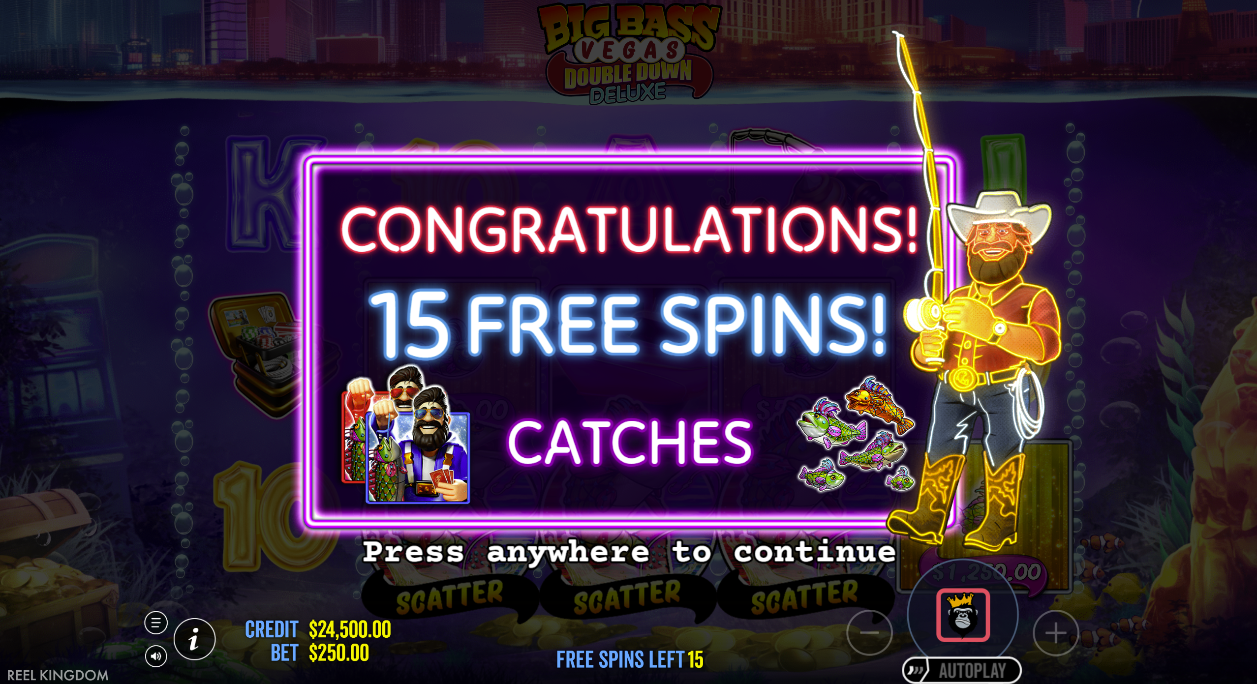 Triggering 10 free spins starts the main event. Money fish with cash values land, and the appearance of either type of fisherman wild collects them. The chance of a Double Down Wild landing adds a huge layer of anticipation and volatility to every spin, as it can instantly supercharge the entire round's payout.